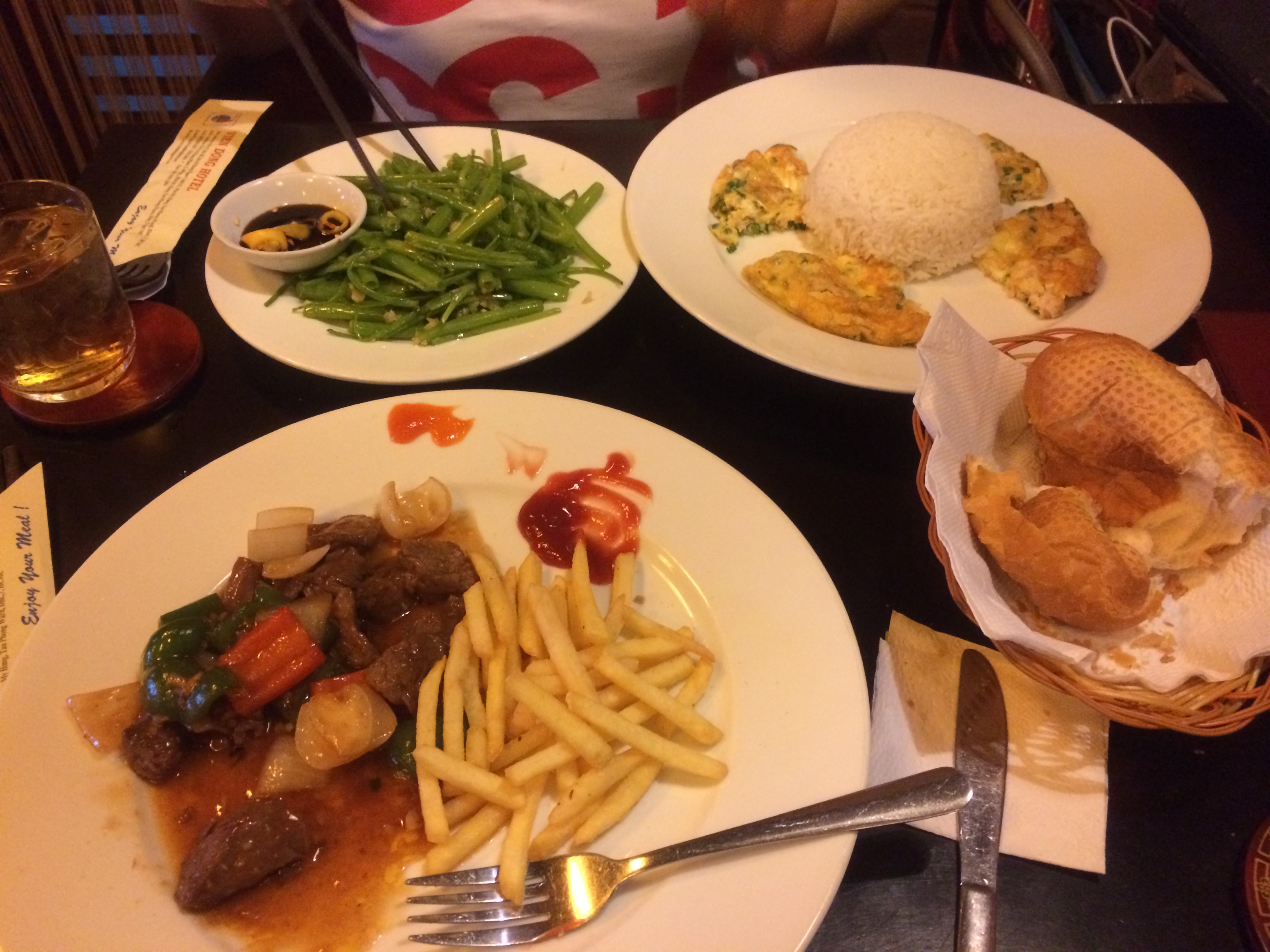 에밀리와 내가 저녁을 먹으러 자주가는 호텔1층 식당이 있었는데, 거기 음식은 싸고 맛있으며 종류가 다양했다. 그래서 먹고 싶은 메뉴가 딱히 생각나지 않을 땐 이 식당에서 다양하게 시켜먹었다. 사진의 메뉴는 찹스테이크와 프렌치프라이, 반미빵, 공심채, 계란 오므라이스 였는데, 오므라이스는 우리가 생각했던것과 달라서 약간 당황했지만 맛은 괜찮았다. 호텔1층에 위치한 이식당은 보통 호텔에 묵는 손님들이 자주 이용해서 외국인들이 많았다. 그래서 그런지 향신료가 많이 가미되거나 고수가 함께 나오는 일은 없었다. 베트남사람들은 워낙 소식을 해서 그런지 내가 이것 저것 시키면 종업원들이 놀랄때가 있었다. 조금 민망하게도ㅎㅎ 맛있어서 자주가고 거의 단골로 이용해서 나중에 한국에 돌아가야 할때 쯤엔 너무 아쉬웠다.