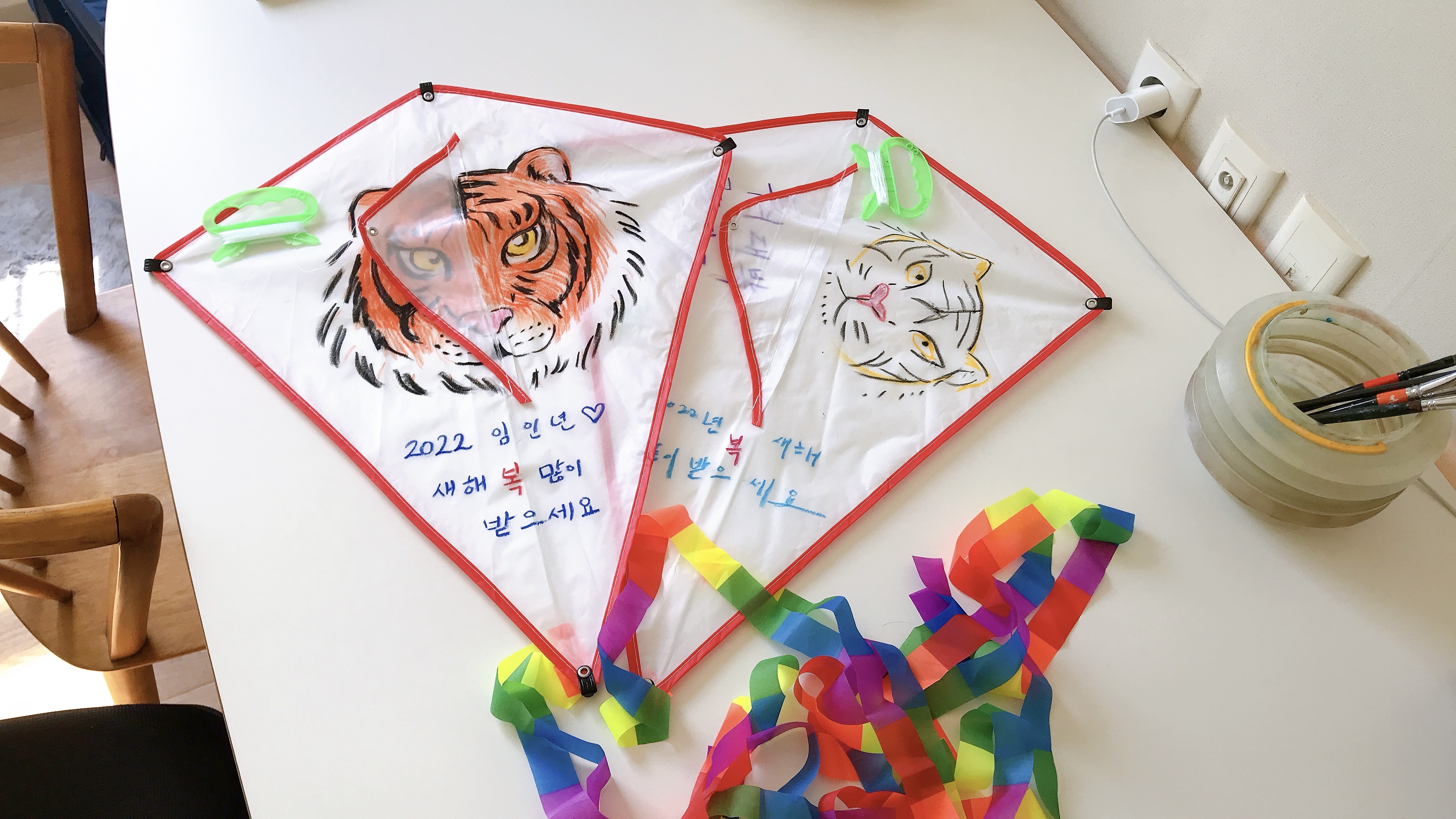 연만들기는 아주 오래전 부터했던 놀이인데, 설부터 대보름까지 날렸으며, 그 이후에는 연을 끊어서 날려보내고 더이상 연을 날리지 않았는데, 대보름이 지났는데도 연을 날리는 사람을 보면 고리백정이라고 놀렸다고 한다. 이 말은 당시 농사를 주로 했던 때에 그해 농사준비가 늦어질가봐 염려해서 했던 말이라고 한다. 그만큼 연날리기가 매우 재미있던 놀이 중 하나라는 것을 알 수있다. 연을 직접 만들기 위해서는 종이와 대나무살이 필요한데 요즘은 문방구가 없어지는 추세라 밖에서 쉽게 구하기는 어려울 수 있다. 나도 직접 만들어서 날리고 싶었는데 대나무살을 구할 수가 없었다. 인터넷을 찾아보니 대나무살을 따로 팔긴 하는데 양이 많아서 보류하고 다른 방법을 찾아봤다. 직접만드는 것이 좋지만 아쉽게도 바로 구할 수 있는건 반제품을 구매하는 것이 었다. 반제품은 가격도 저렴해서 집에 아이가 있거나 어른이어도 나처럼 만들어서 날려보고 싶다면 쉽게 도전할 수있다. 원하는 그림을 그리고 줄을 연결하면 되는 데 너무 쉽다. 이렇게 쉬우면 연구하는 창의력은 안생길 것 같지만 만든 후에 날리는 것도 나름 머리를 써서 해야 하는 거라서 일단은 그냥 넘어갔다. 나는 2022 임인년을 기념해 호랑이 그림을 그려서 완성했다. 새해 소원이 있다면 적는 것도 좋을 것 같다. 이제 밖으로 나가서 연을 날려보자.