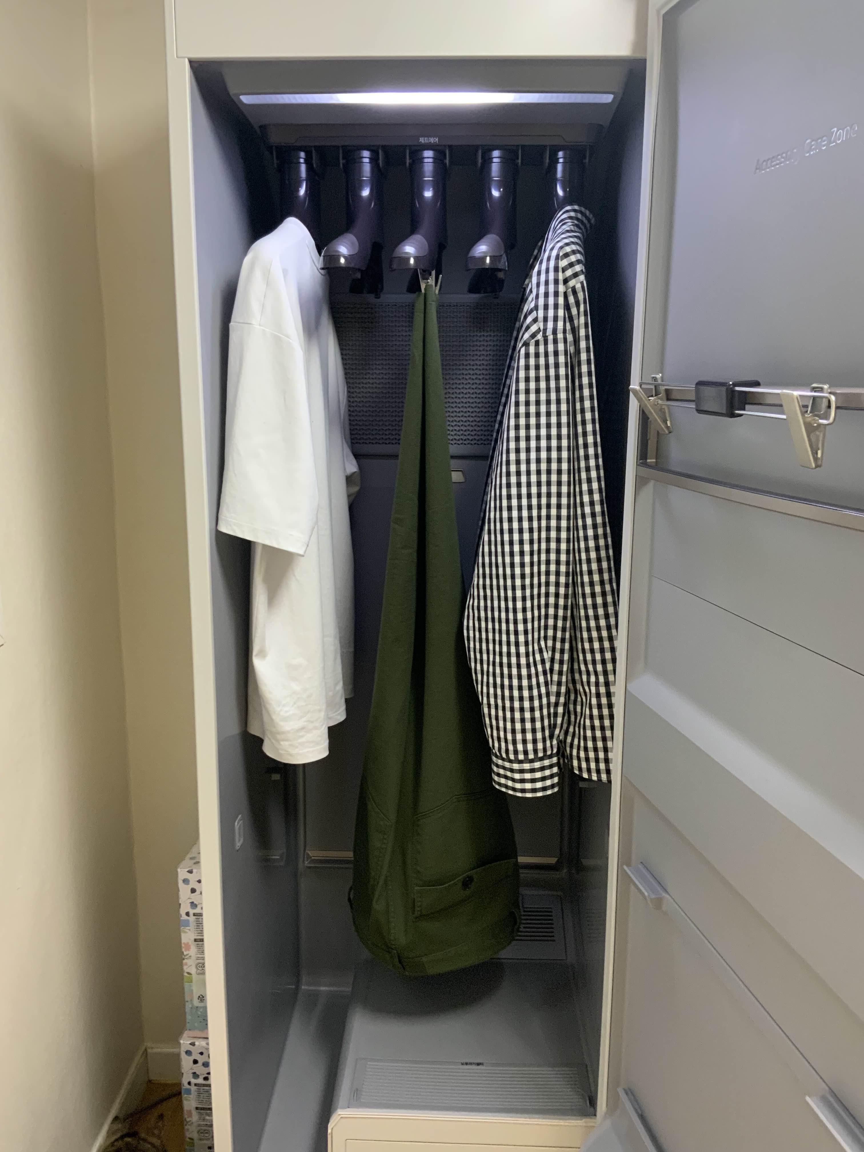 나는 내가 옷이 많지는 않지만 여름에 특히 습한날 공간제습기능을 아주 유용하게 사용하고 있어서 에어드레서를 만족하면서 사용중이다. 우리집은 에어드레서가 옷방에 있기때문에 습한날 한번씩 공간제습기능을 쓰면 옷을 뽀송하게 입을 수있고, 가끔 빨래도 쿰쿰한 냄새없이 말리고 싶다면 이 기능을 사용한다. 겨울엔 미세먼지때문에 밖에서 들어오면 코트나 마스크를 넣어두고 미세먼지 관리와 살균을 한다. 살균기능이 있어서 요즘같은 때에 사용하기 더 유용한것 같다.