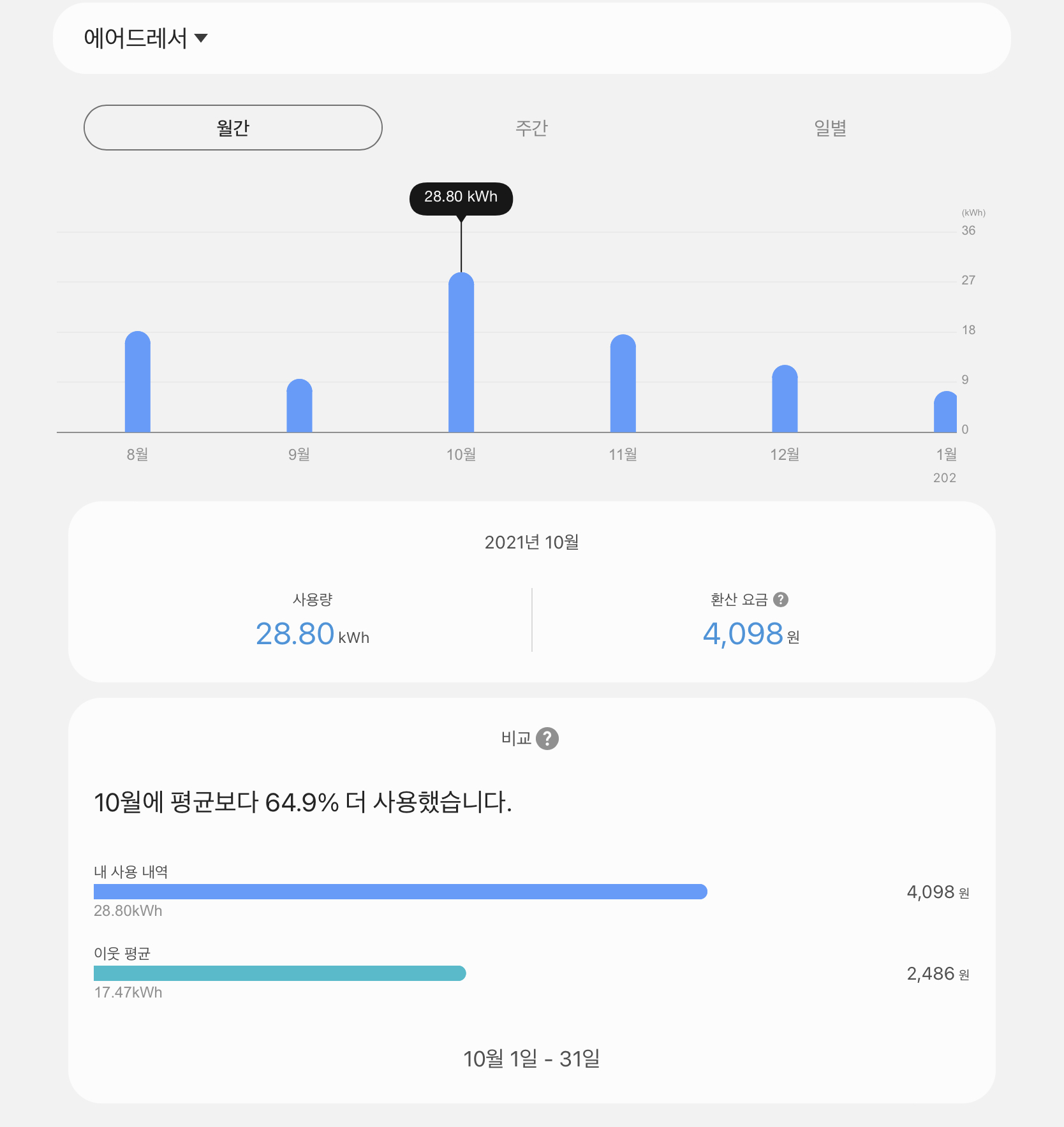 전력 소모와 소음도 생각보다 크지않다. 내가 가장 많이 사용한 달이 10월이었는데, 그때 28.80kWh를 사용했고 요금은 4,098원으로 나왔다. 그렇다면 에어드레서는 어디에 두는 것이 효과적일까? 거실? 방? 단순히 의류를 관리하는 기능만 사용 할 것이라면 거실에 두어도 좋을 것 같다. 나처럼 공간제습 모드까지 사용할것 이라면 방에두는 것이 효과적이다. 방에 두어도 소음이 크지 않아서 괜찮고, 더 조용한 모드로도 사용이 가능하다.